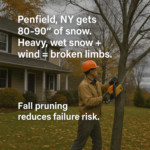 Penfield, NY averages about 80–90 inches of snow each year. Lake-effect bands stay active through winter, so weak limbs and crowded crowns fail under wet, heavy snow.